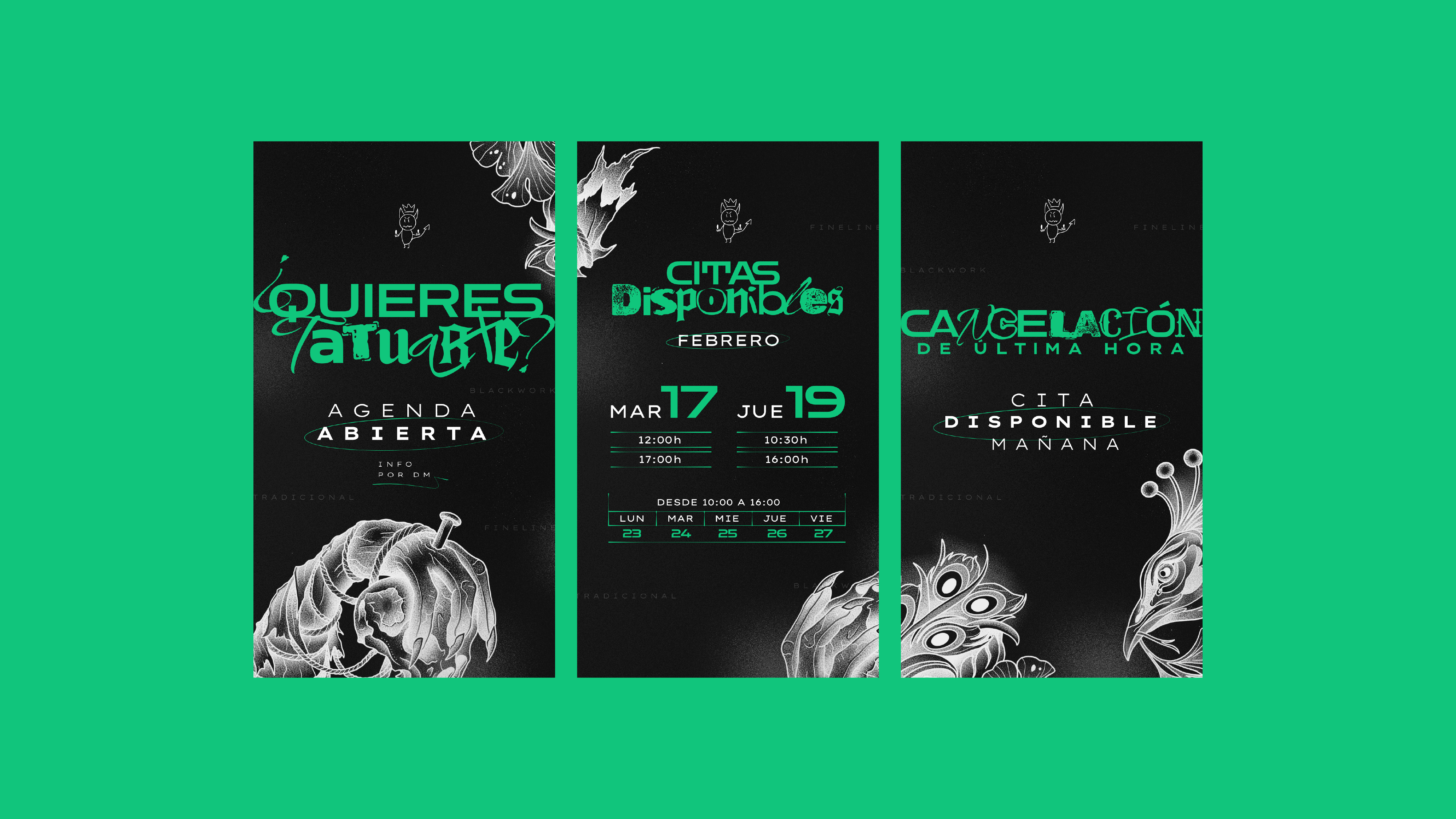 La propuesta se basa en el uso estratégico del copywriting y la jerarquía tipográfica para transmitir personalidad y generar sensación de urgencia y disponibilidad, reforzando la identidad del estudio y el estilo propio del tatuador.