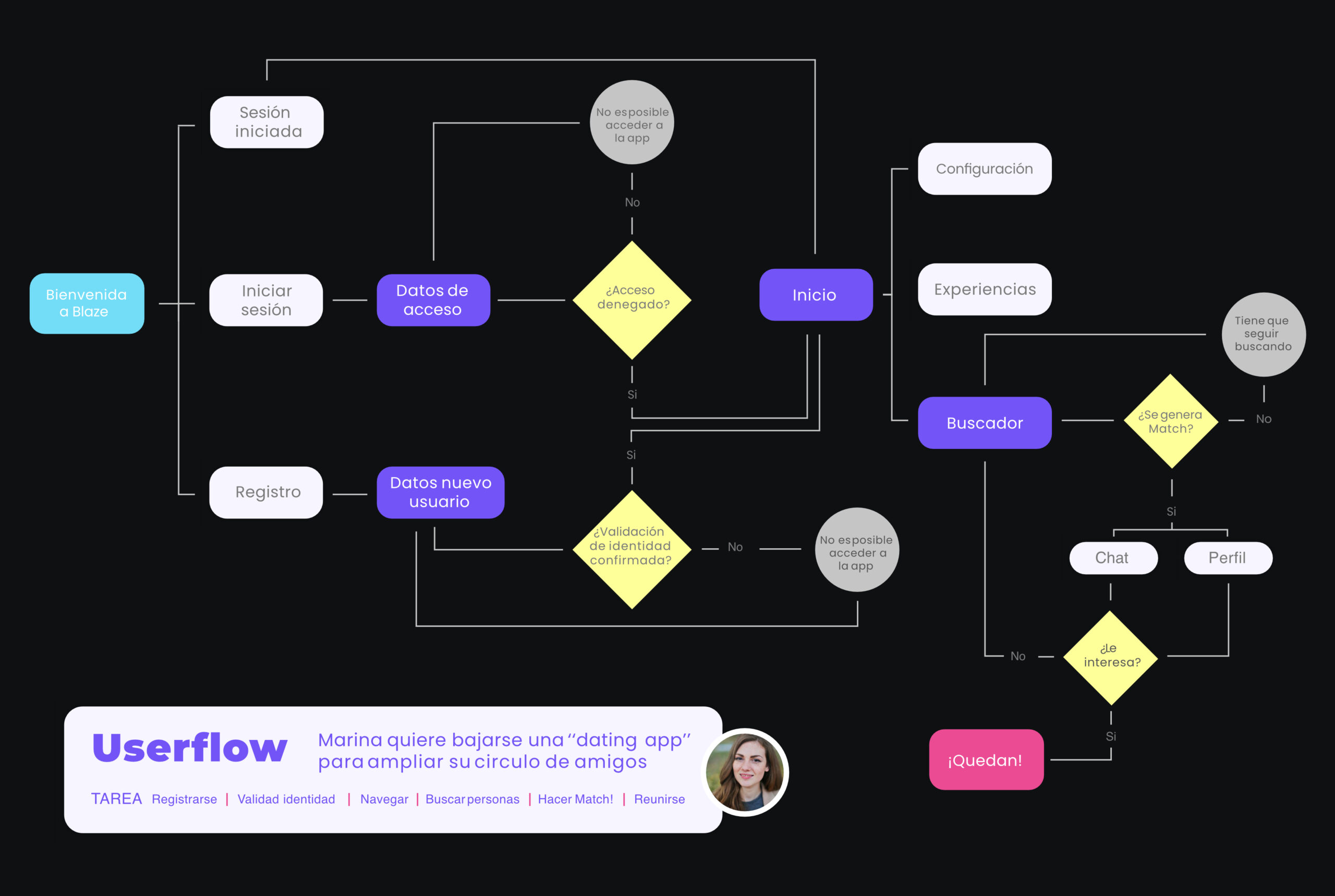 El flujo de usuario en el proyecto Blaze mapea el recorrido del usuario a través de la aplicación, ayudando a identificar puntos de dolor y optimizar la interacción con el servicio.