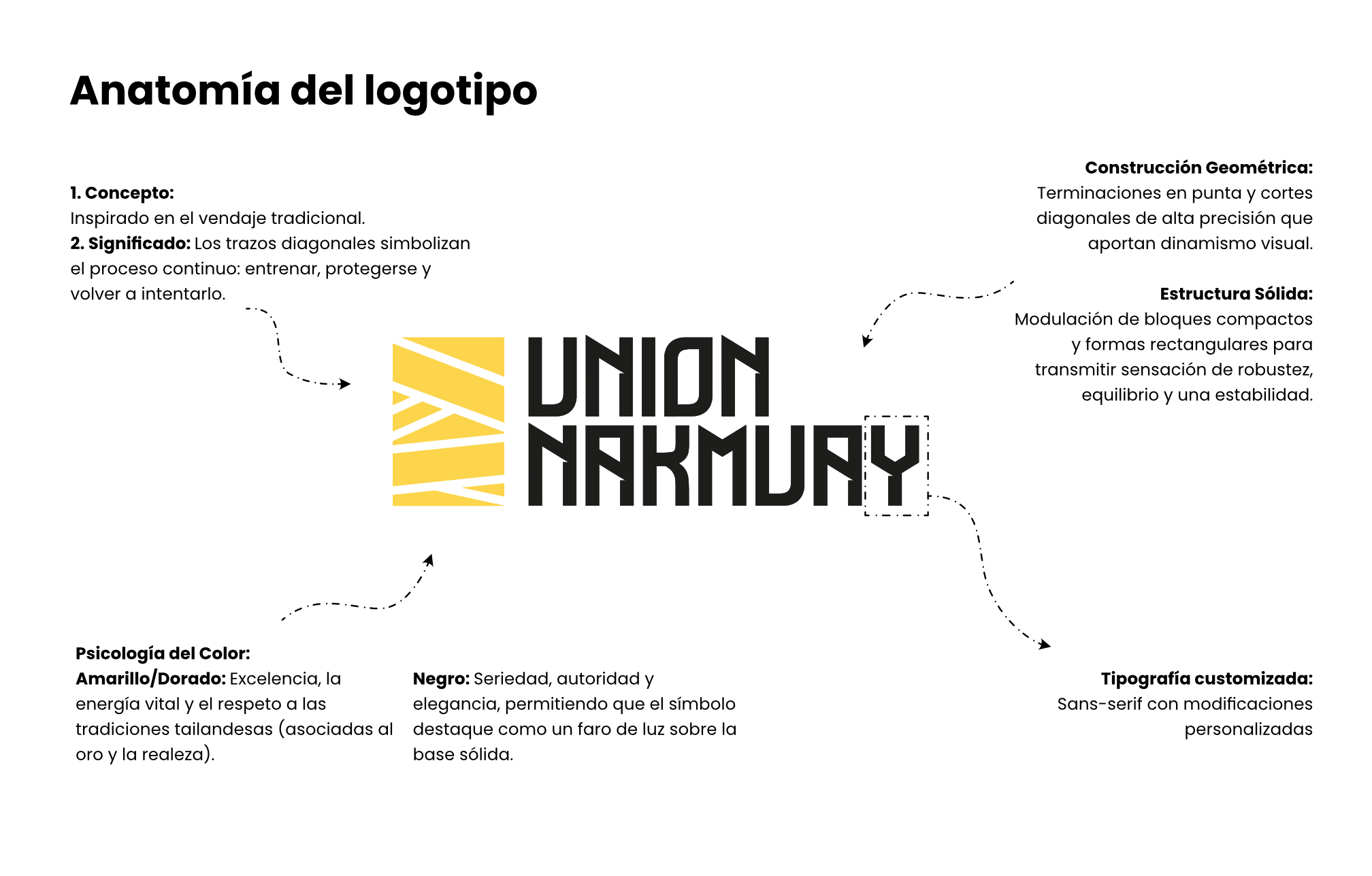 El logotipo de Unión Nakmuay nace de la síntesis entre disciplina y constancia. Su construcción geométrica y los cortes angulares remiten a la precisión del Muay Thai. El símbolo se inspira en las vendas deportivas, un elemento esencial en la práctica de este deporte que representa preparación, cuidado y compromiso. Más que un gesto previo al combate, las vendas simbolizan el proceso: entrenar, protegerse y volver a intentarlo.
